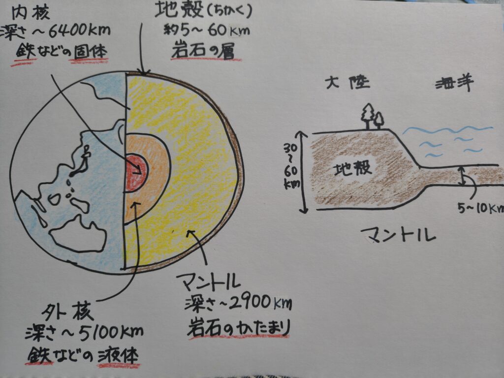 地球内部は大きく分けると、核(内核と外核)、マントル、地殻の3つの層構造になるそうです。