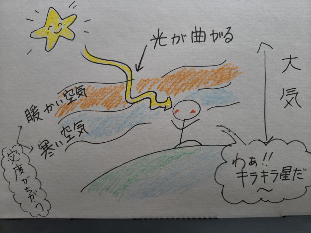 星の光は温度や密度が違う空気の層を通る事で進み方が変わり、光がゆらいでみえるのだそうです。
