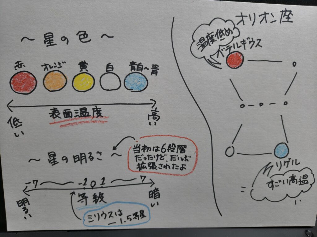 星の表面温度は左上のベテルギウスが赤色、右下のリゲルは青色にあたります。みなさんも是非確かめてみてくださいね。それでは明日こそたくさんの星たちに逢えますように~おやすみなさい☆