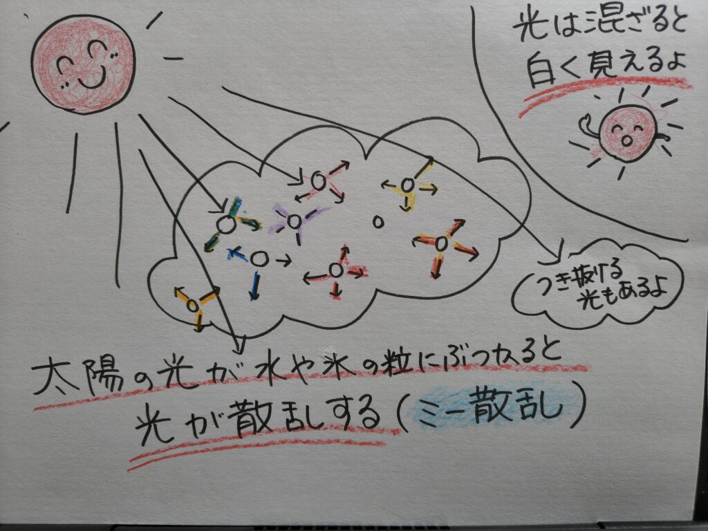 水や氷の粒が集まった雲。なぜ私達の目には、白くうつるのでしょうか?それは太陽の光が関係しています。太陽の光には青や赤などたくさんの色が含まれていますが、色んな色が集まると白い光に見えるのです。太陽の光が雲を通る時、水や氷の粒に当たって色んな角度に光が散乱します(ミー散乱)。この散らばった光が雲に行きわたると、私達の目には白い雲に見えるのです。少しむずかしく思えますが、図にするとこんな感じです♪